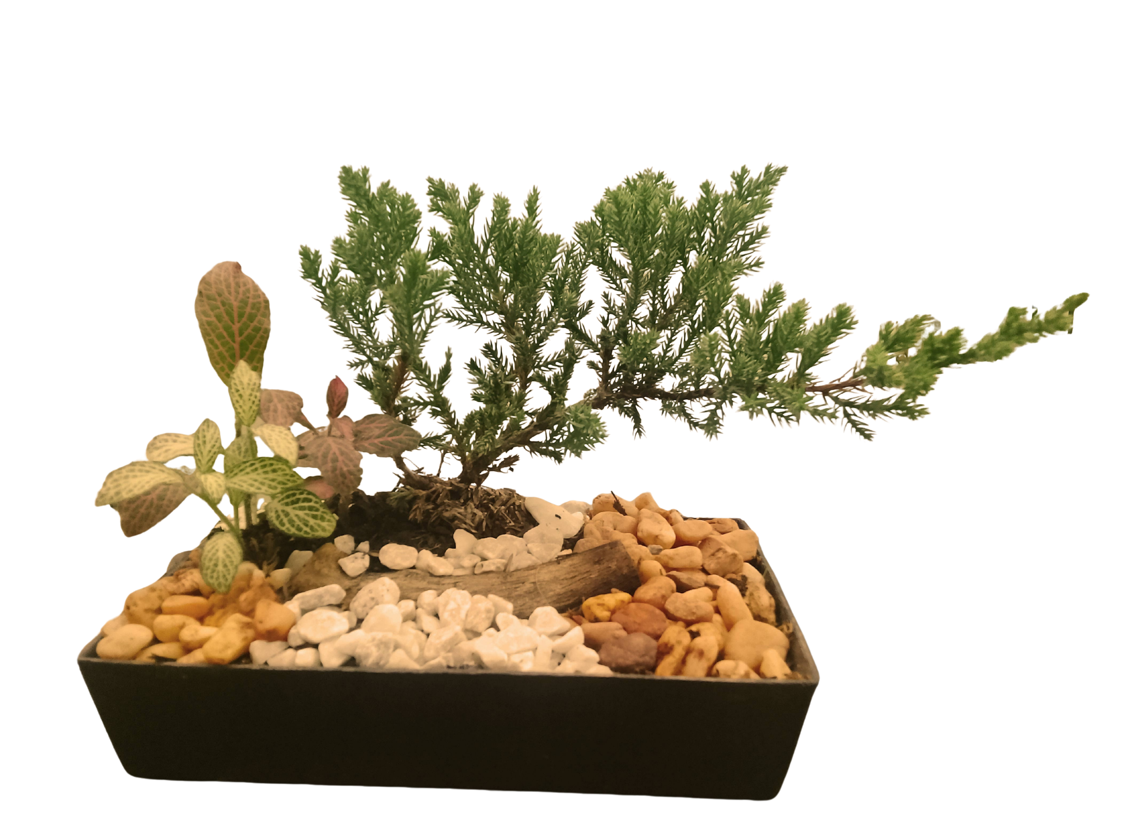 Description: Elevate your space with the Zen Garden 2, a curated botanical arrangement exclusive to Greenheart. This low-profile dish garden combines structural elegance with vibrant foliage to create a calming focal point in any room.